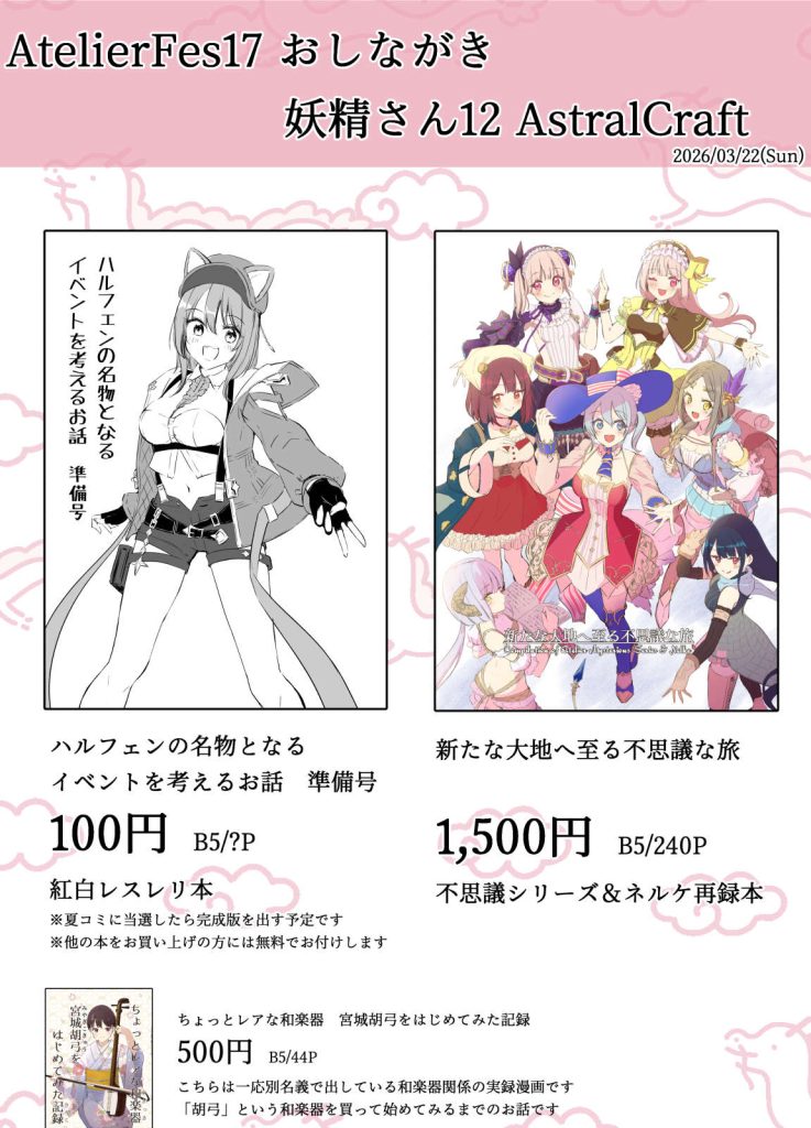2026年3月22日(日)川口市民ホールフレンディアにて開催される「AtelierFes17」のサークル参加のお知らせです。